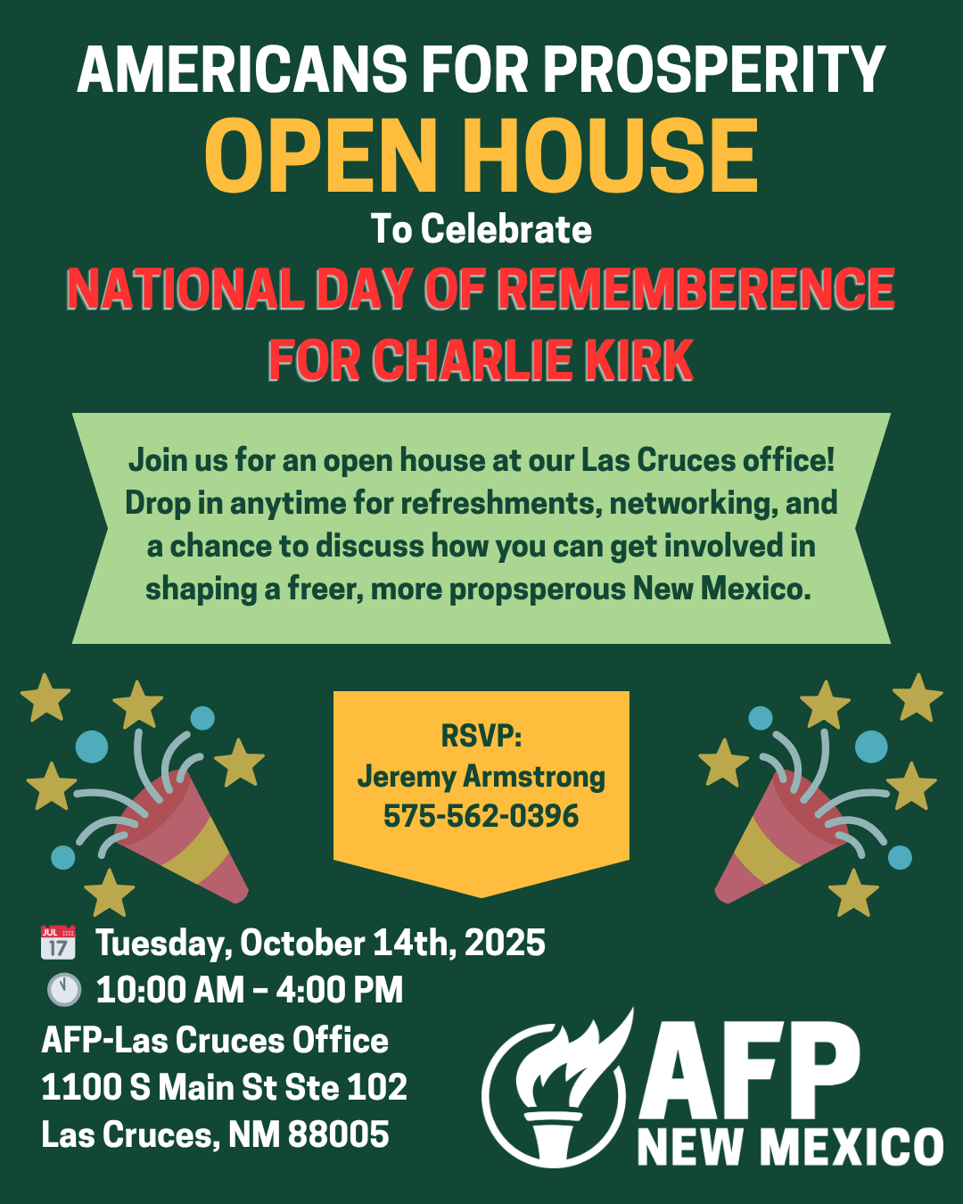 AFP LC Office 1100 S Main St Ste 102, Las Cruces, NM, United StatesJoin us for a day of connection, and introduction in how to get involved in civic engagement. We also plan to honor the life and legacy of Charlie Kirk on his birthday—now recognized nationally as a Day of Remembrance. This open house is a chance to: 🎉 Celebrate Charlie Kirk’s impact on civic education and grassroots activism […]